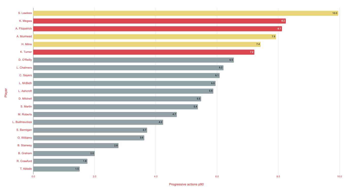 The picture gets worse if you look at who these progressive action moments come from. Stevie Lawless is a beast. When he’s fit and contributing, he gets 10 progressive actions per game. On his own, he’s enough to lift us from the ‘low playoff’ attacking unit to ‘not far from champions.’